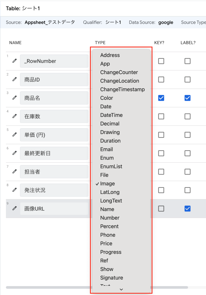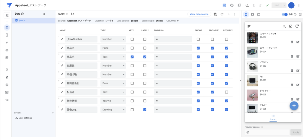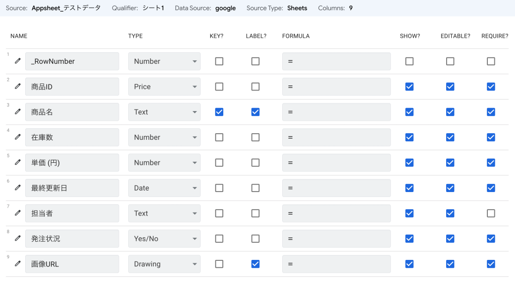 アプリに接続するデータソース(Googleスプレッドシートなど)を定義し、どのシート(表)を利用するかを設定します。各データの列(Columns)に入力されるデータ型(テキスト、数値、日付、画像など)や、必須項目、初期値などを細かく設定します。
