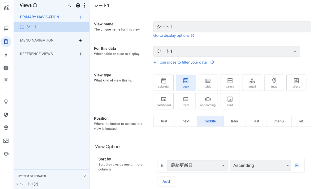 ユーザーがデータを見るためのビュー(画面)を作成・編集します。ビューの種類(テーブル、デッキ、カレンダー、マップなど)や、データの表示順序、フィルター、デザイン(色やアイコン)を設定し、アプリの使い勝手(UX)を決定します。