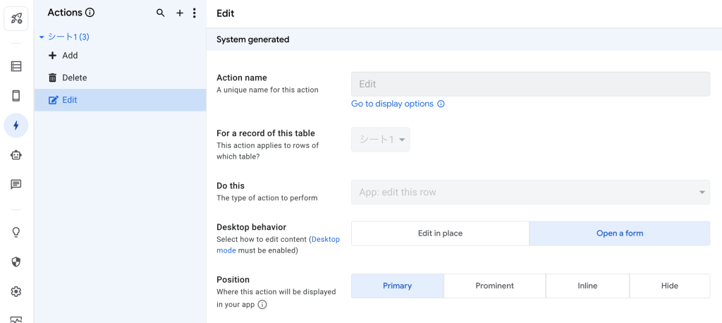 ユーザーがボタンを押したり、データをスワイプしたりしたときに実行されるアクションを定義します。他のビューへの移動、データのコピー、メール送信、外部URLへの移動など、様々なロジックをノーコードで組み込みます。