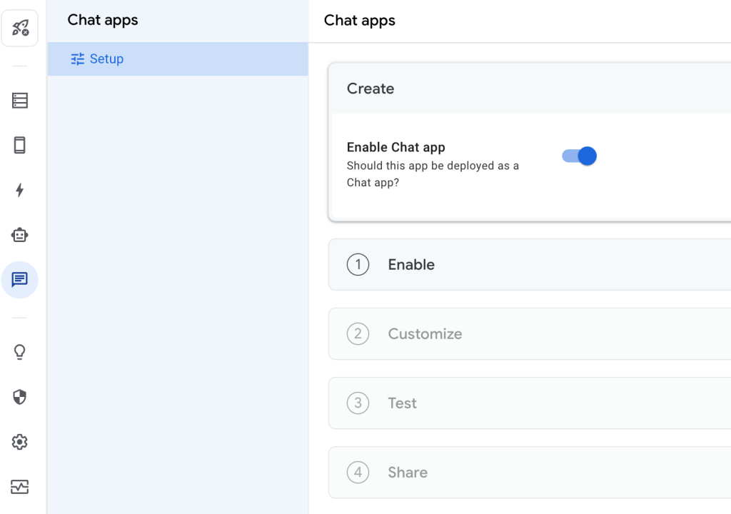 開発中のアプリをGoogle Chatと連携させるための設定を行います。チャットでアプリのアラートを通知したり、チャットからコマンドを通じてアプリのデータを操作したりするための統合設定を行います。