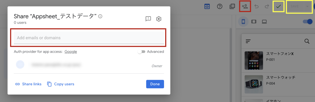 ③「Add emails or domains」欄に、アプリを使わせたい人のメールアドレスを入力します。