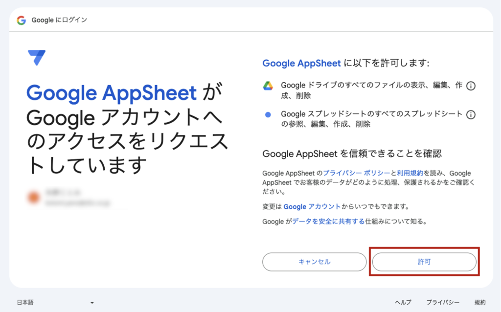 利用するGoogleアカウントを選択し、許可ボタンをクリックします。