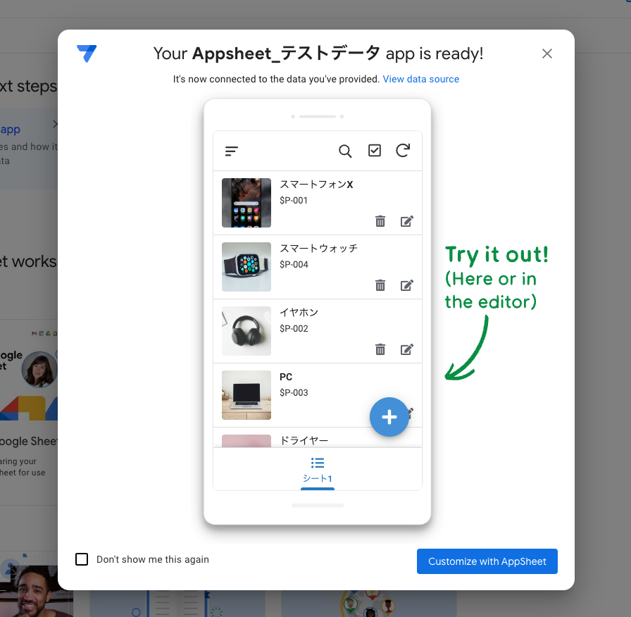 このような画面が出てきたら、右下の「Customize with AppSheet」をクリックして、開発を開始します!