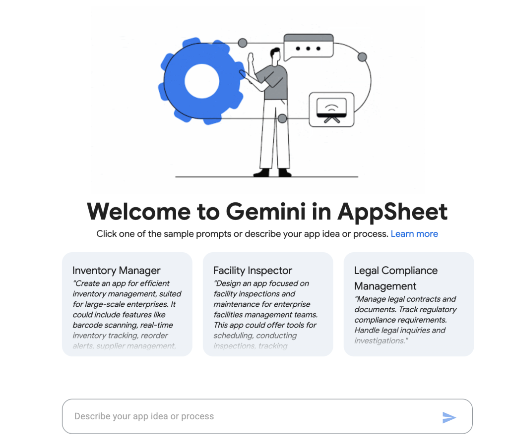 ユーザーが作りたいアプリのアイデアや業務プロセスを自然言語で入力するだけで、Geminiがそれを理解し、アプリの雛形を自動的に生成してくれる機能です。「作りたいアプリのアイデアはあるが、どうデータ化すればいいかわからない」場合に開発をアシスタントしてくれます。