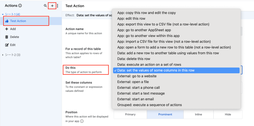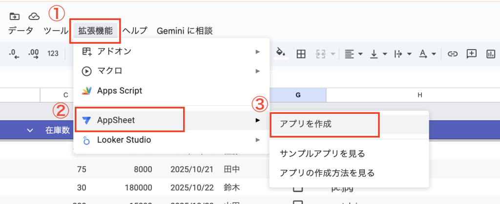 メニューバーの拡張機能から「AppSheet」を選択し、「アプリを作成」をクリックします。