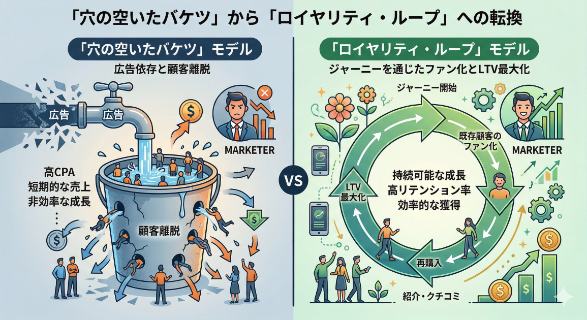 B2C領域では、SNS広告で一時的に集客するモデルを捨て、LINEや独自アプリを基点とした「コミュニティ型ジャーニー」を構築した企業が強いと思われます。顧客同士が体験を共有し、企業がそのフィードバックを即座に製品へ反映させる。この循環が、広告なしでも「勝手に売れる」仕組み、つまりLTVの最大化を生んでいるのでしょう。