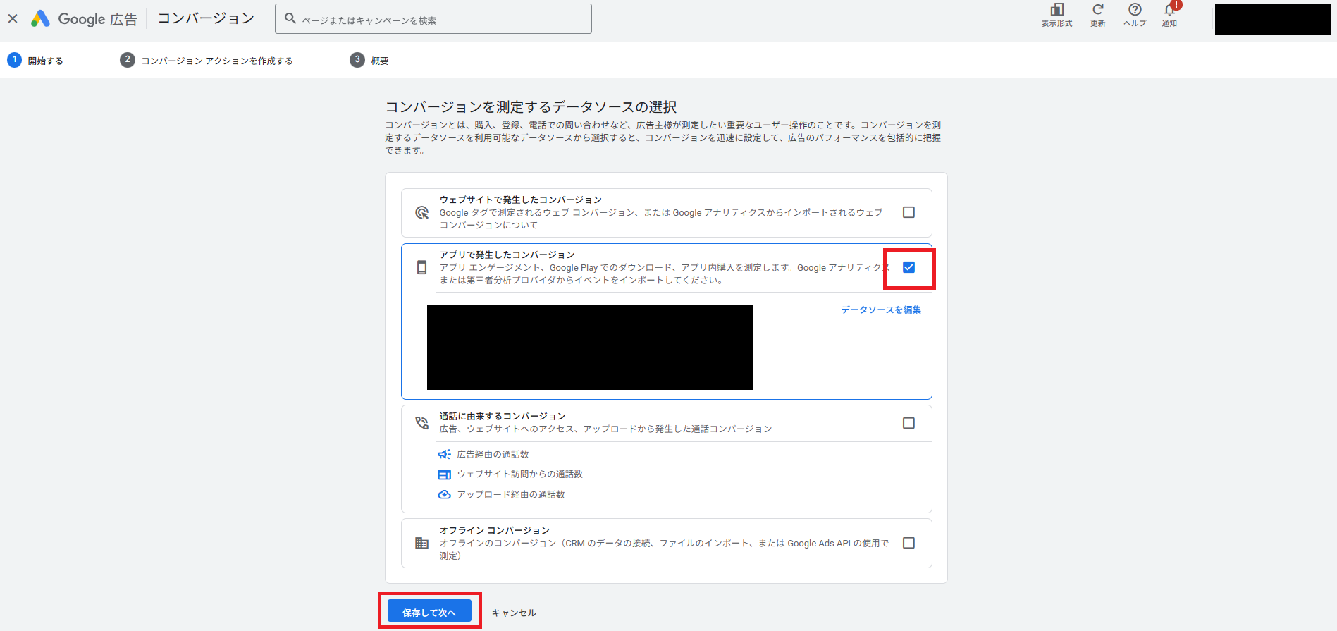 中段にある「アプリで発生したコンバージョン」にチェックを入れ、保存して次へ