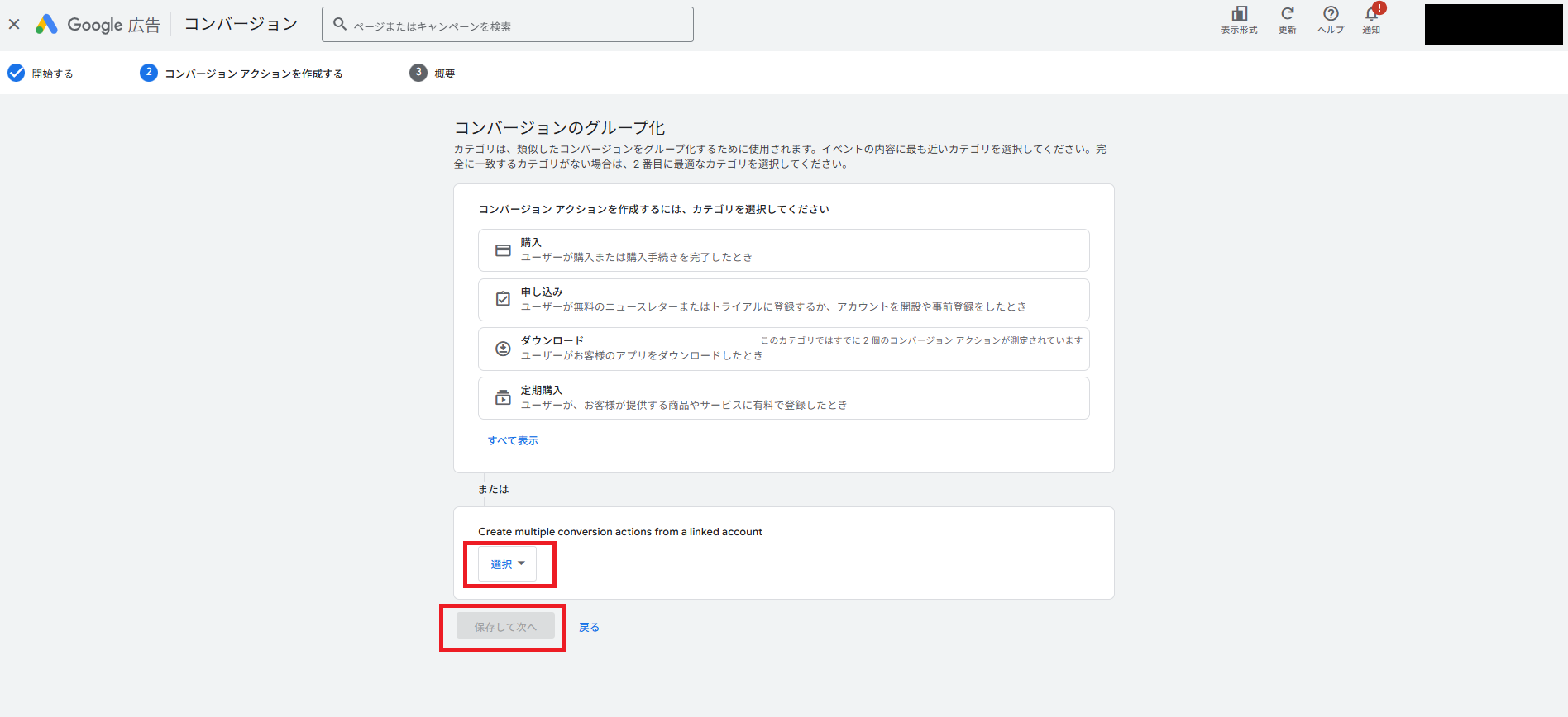 「Create multiple conversion actions from a linked account」で利用している分析ツール(Firebase/AAP)を選択し、保存して次へ
