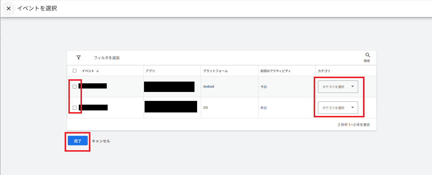 インポートするイベントにチェックを入れ、カテゴリを選択し、完了をクリック