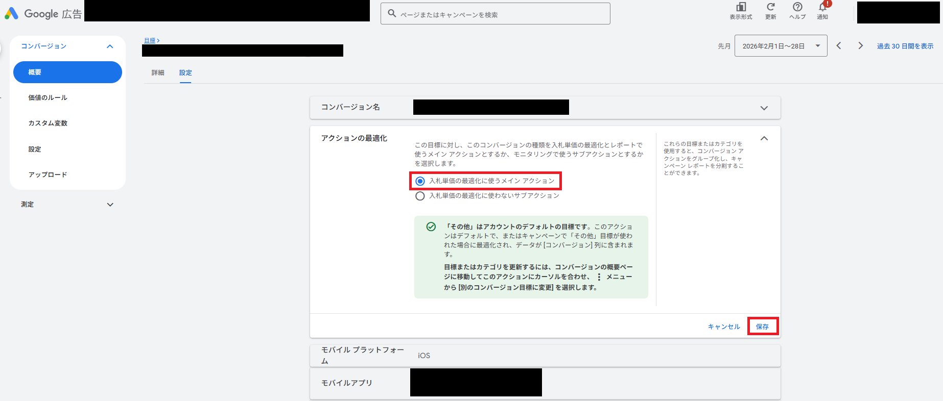 インポートしたコンバージョン設定画面の「アクションの最適化」で、「入札単価の最適化に使うメインアクション」を選択して保存