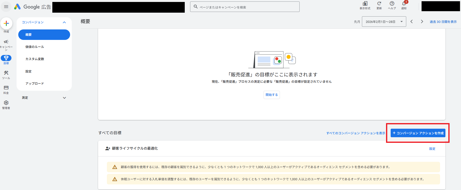 Google広告管理画面の「目標」の「概要」から、「コンバージョンアクションを作成」をクリック