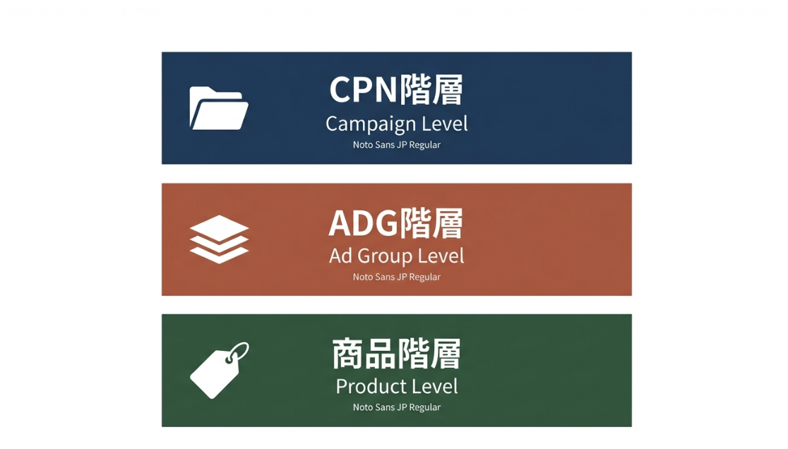 ショッピング広告の基本構造は、キャンペーン、広告グループ、そして商品グループ(商品階層)という3つのレイヤーで成り立っています。