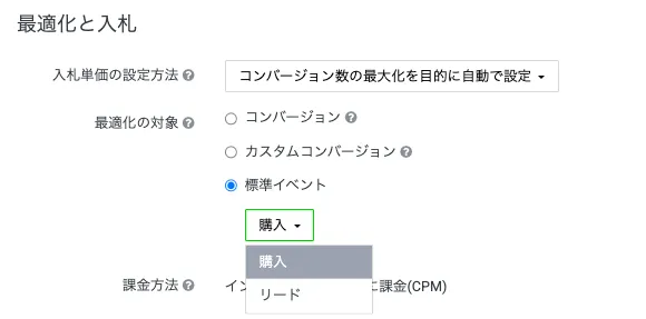 また、標準イベントを「コンバージョン獲得を目的に配信を最適化する際に利用したい」場合には、標準イベントの設定で「購入」または「リード」のいずれかを選択する必要があります。