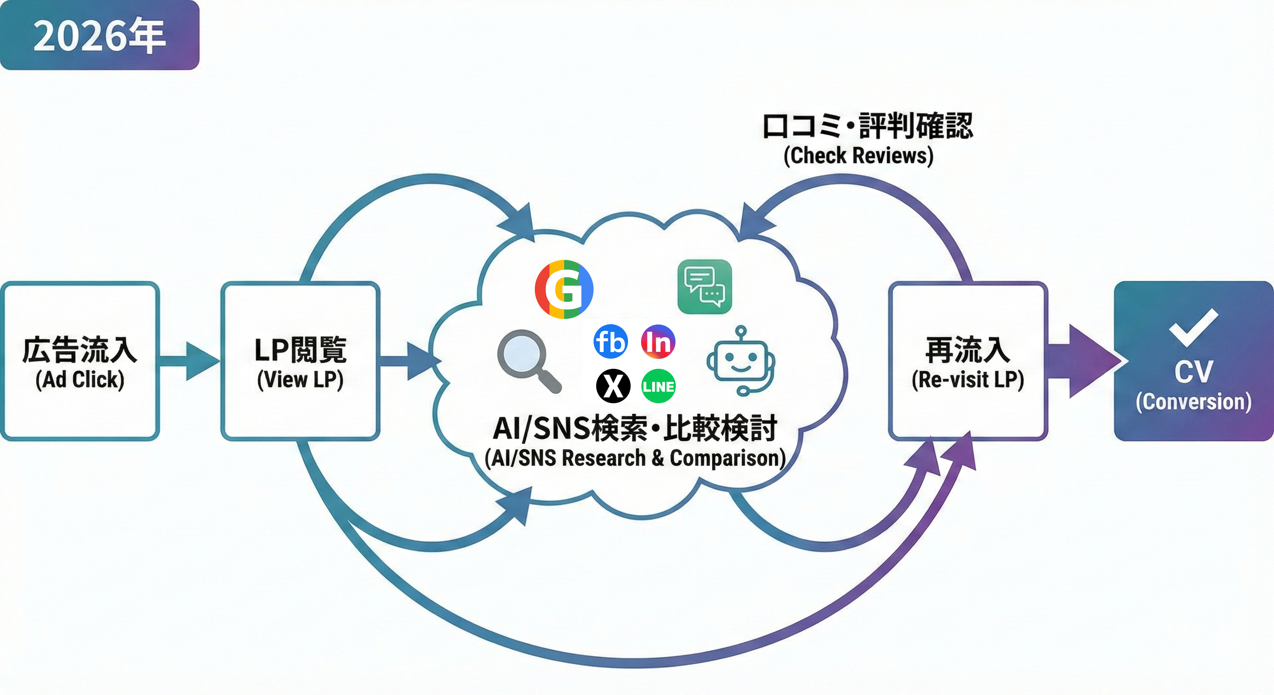 実は、「LPのゴール=商品購入(または問い合わせ)」と安易に決めてしまうのは、2026年の戦略としては不十分な場合があります。ユーザーがSNSの広告から衝動的に流入したのか、比較サイトでじっくり調べてから来たのかによって、提示すべき情報の濃度と「適切なゴール」は異なるからです。