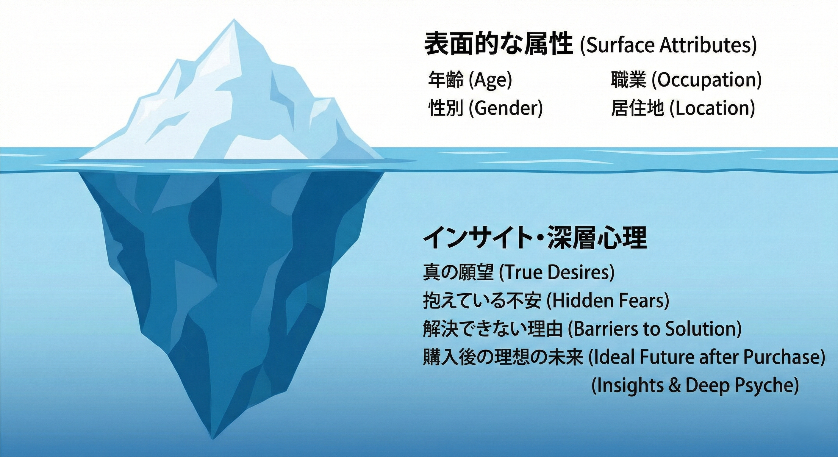 次に、ターゲットとなる「ペルソナ」を固めます。ここでいうペルソナとは、単なる「30代・女性・会社員」といった属性データではありません。2026年のLP制作に求められるのは、ユーザー本人すら気づいていない「インサイト(本音・深層心理)」の特定です。