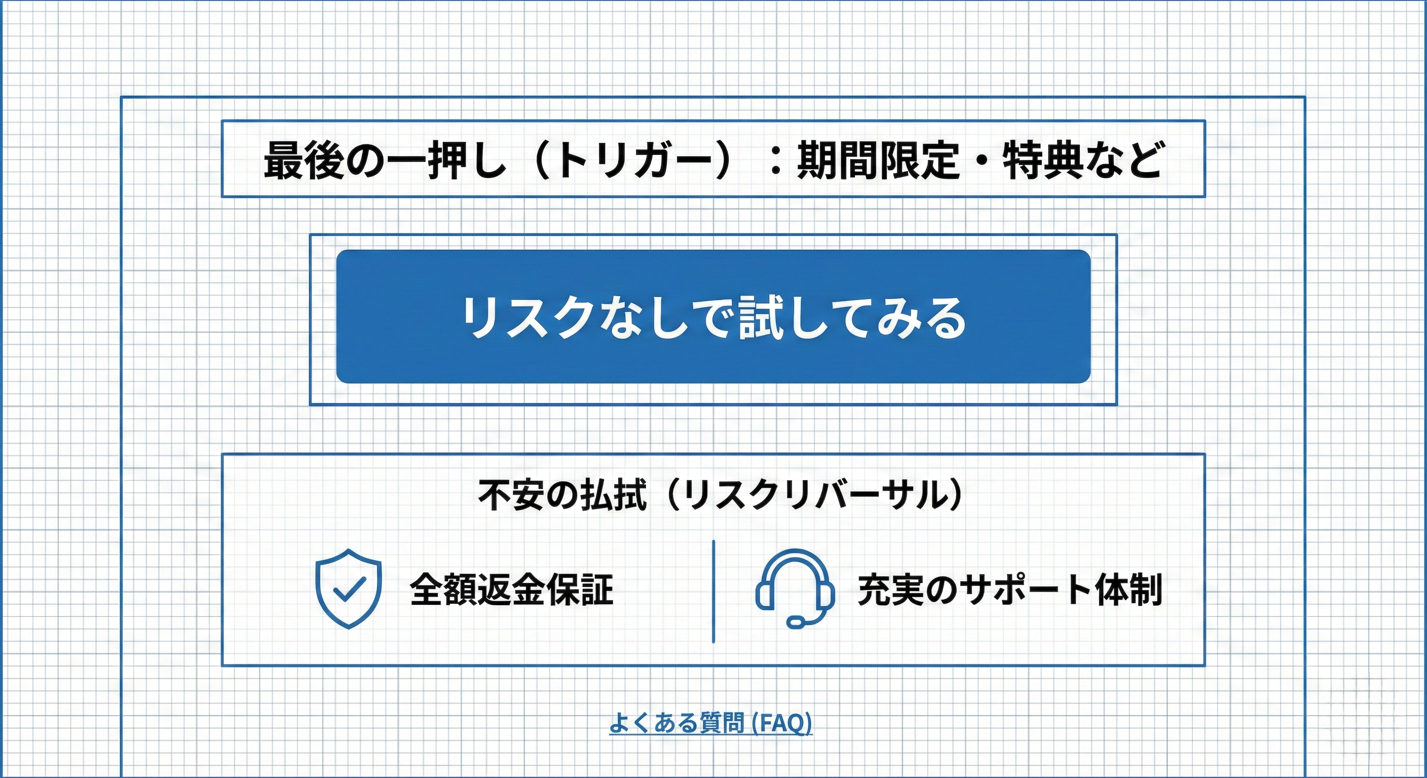 クロージング部(オファーエリア周辺)の役割は、この最後の心理的ハードルを取り除くことです。