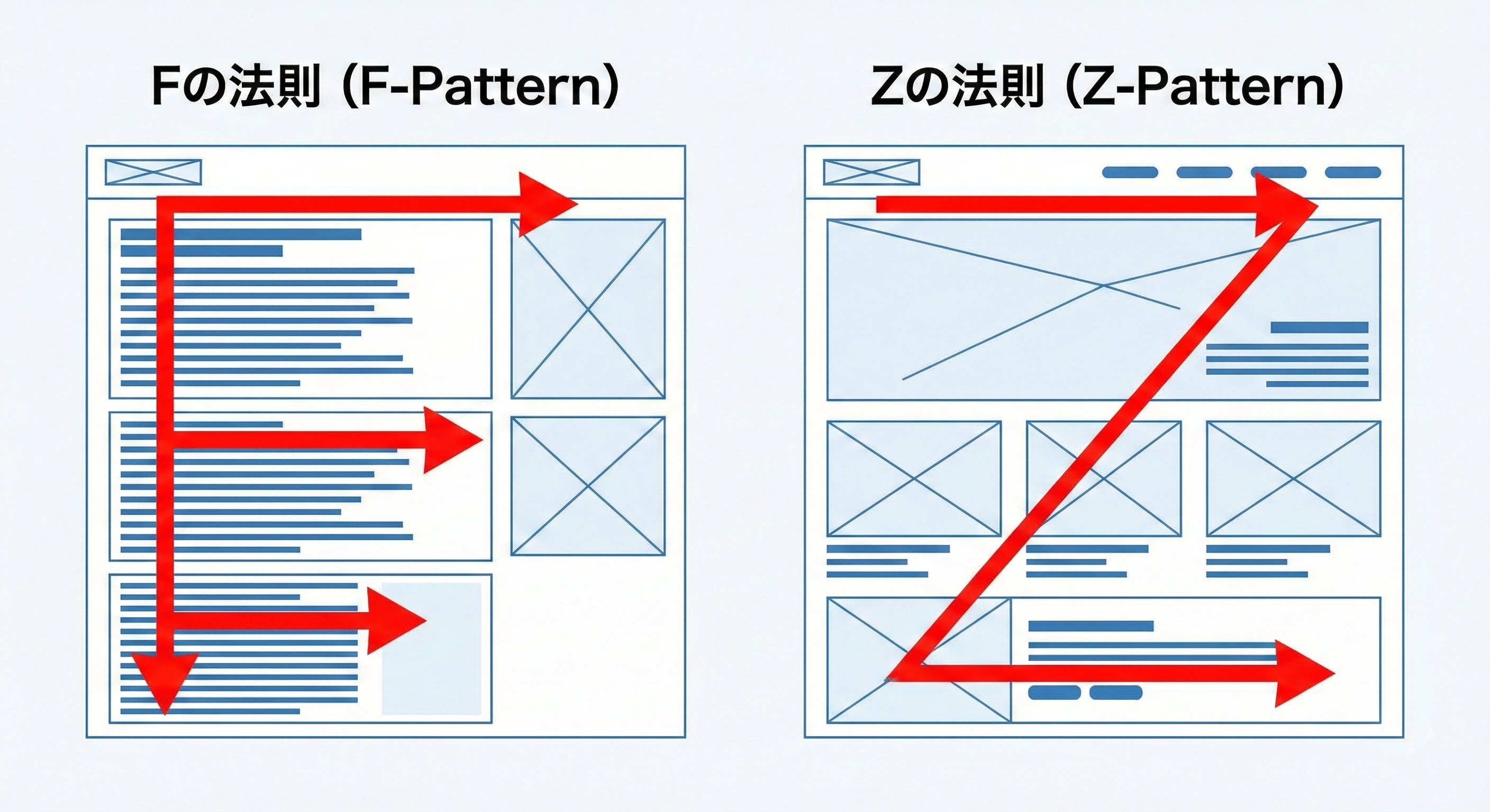 人間がWEBページを見る際、視線の動きには一定のクセがあります。これを無視して情報を配置しても、ユーザーは重要な情報を見落としてしまいます。代表的な2つの法則をWFに取り入れましょう。