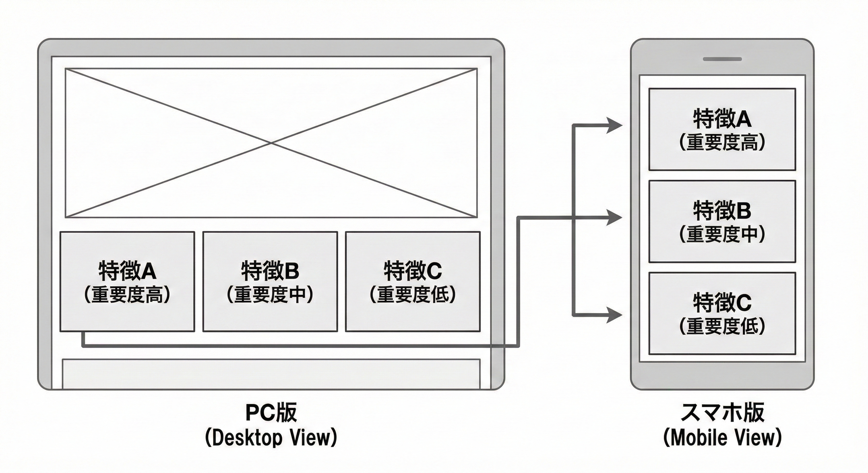 PCの横長の画面では「3つの特徴」を横一列に並べることができますが、スマホの縦長画面では、それらを縦に積むしかありません。このとき、単純に左から順に上から並べるだけでは不十分な場合があります。