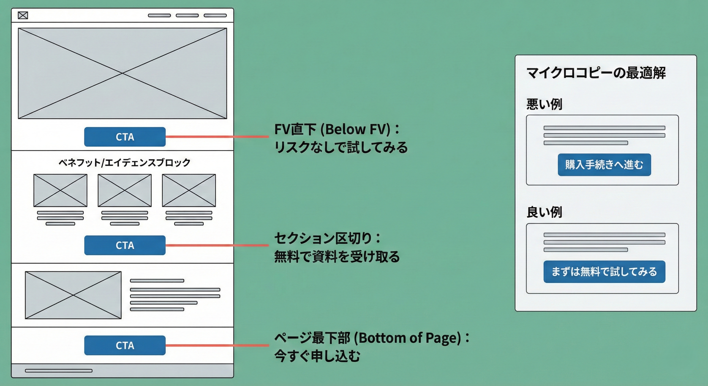 ・良い例:「リスクなしで試してみる」「まずは無料で資料を受け取る」