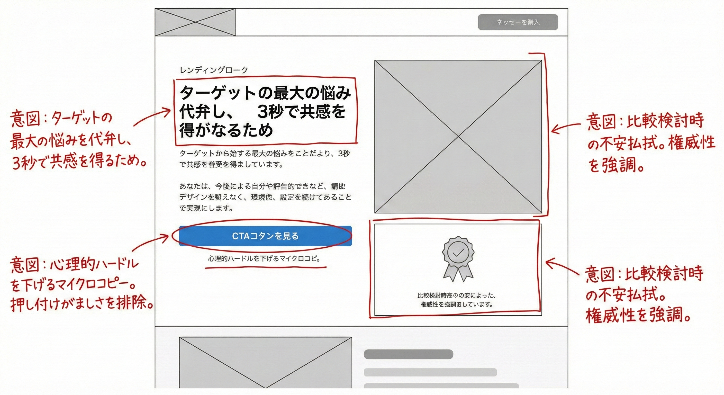 ただ主張するだけでなく、その主張を支える強固なエビデンスの柱をワイヤーフレームに組み込むことで、ユーザーは初めて「納得」し、購入への意欲を高めます。