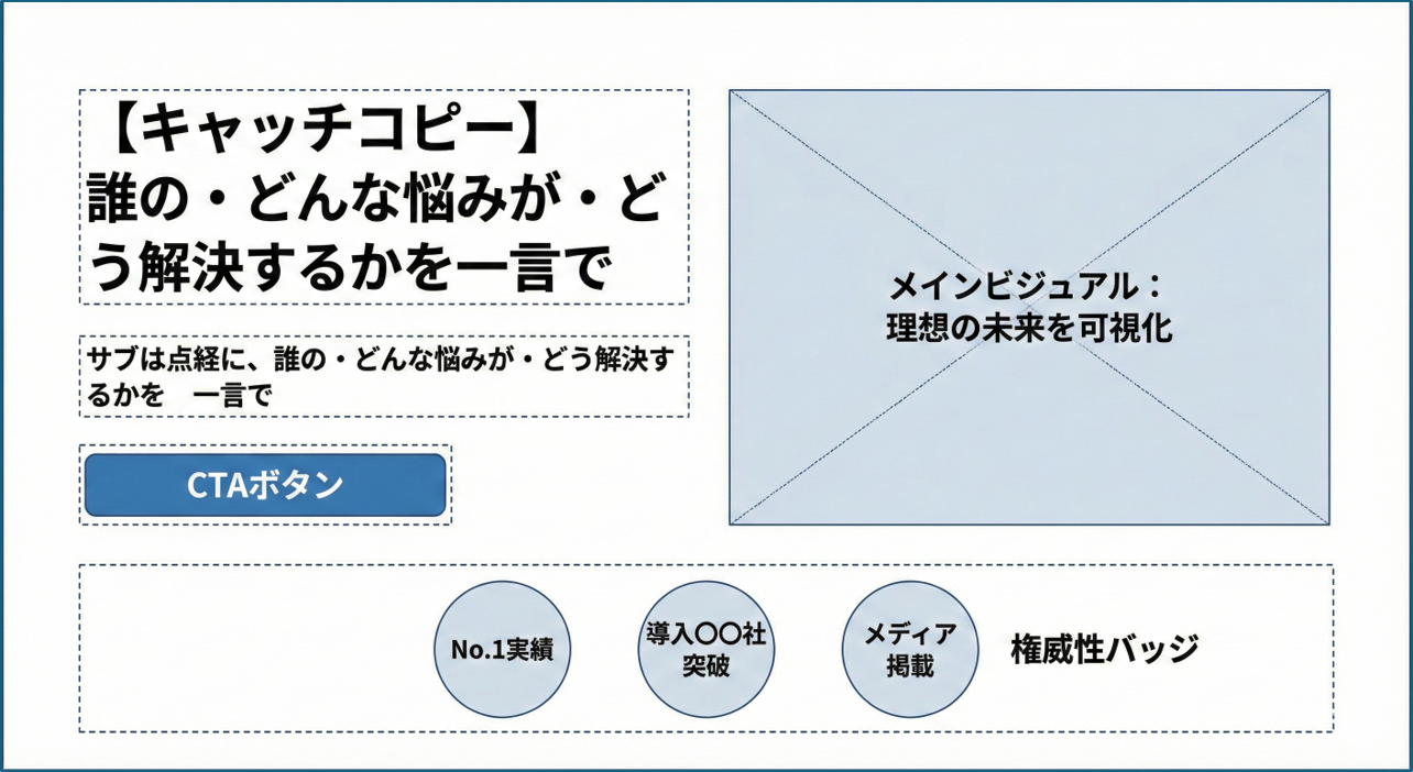 LPの構成において、最もエネルギーを注ぐべきは間違いなくファーストビュー(FV)です。ユーザーはページを開いた瞬間、わずか3秒(スマホならもっと短いとも言われます)で「自分に関係があるか」「読む価値があるか」を直感的に判断します。