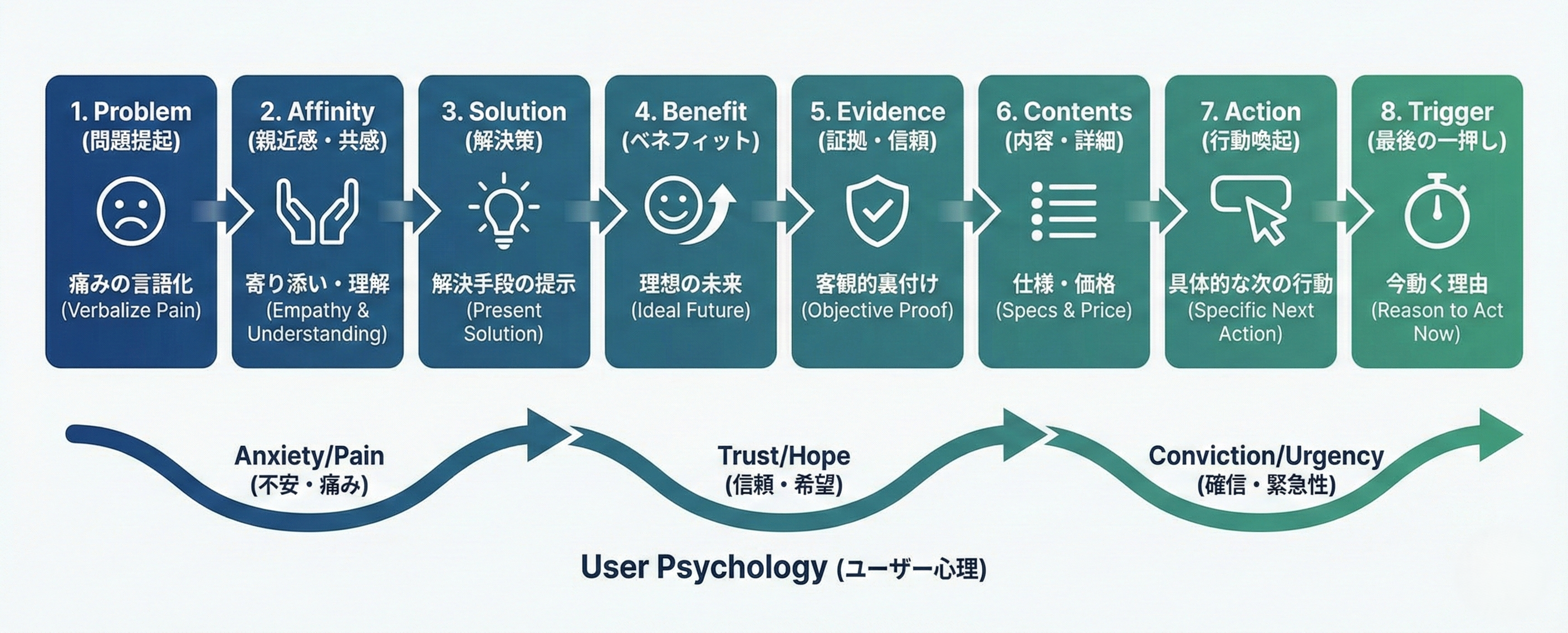 ここでは、数あるフレームワークの中でも、現代のユーザーの心理変容に最もフィットし、高い成約率を叩き出す最強の型を紹介します。この型をベースに、自社独自の要素を肉付けしていくのが最短ルートです。