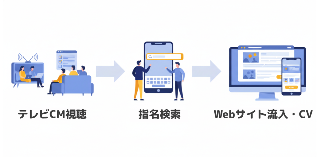 最も顕著なのが「指名検索数(ブランド名での検索)」の増加です。 テレビで認知したユーザーが「気になってスマホで検索する」という行動は非常に一般的です。指名検索は競合他社と比較されにくく、コンバージョン率(CVR)が高い傾向にあります。運用型テレビCMでこの「指名検索」を意図的に作り出すことで、リスティング広告やSEOの効果を最大化できます。
