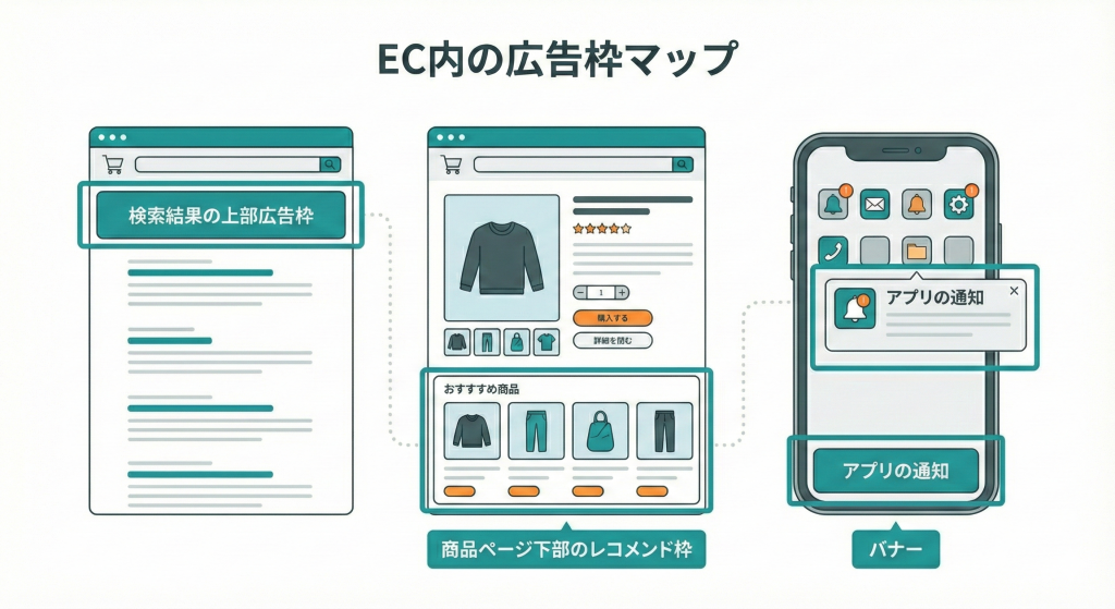 - ECサイト内の広告枠(検索結果上部、商品レコメンド欄など)