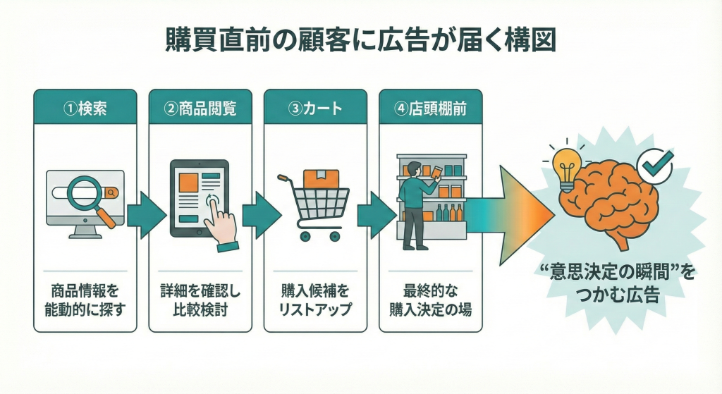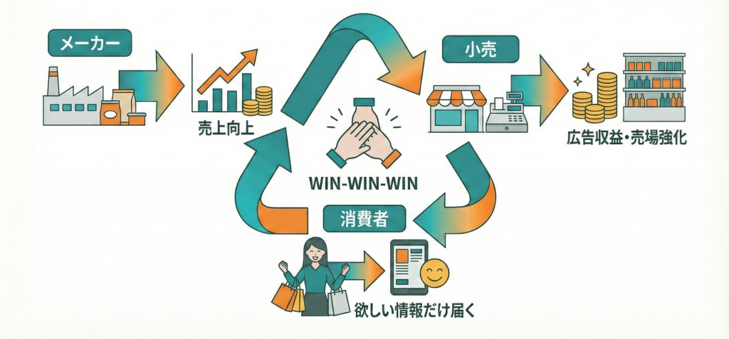 メーカーは、小売の接点を活用して「購買直前の顧客」にアプローチできるため、従来の広告よりも“売上につながりやすい”のが特徴です。