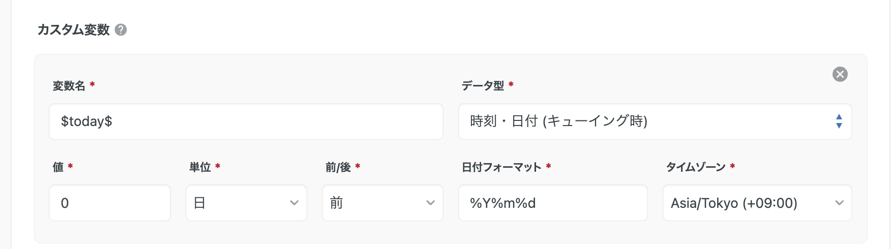 💡データ型の時刻・日付 (キューイング時) と時刻・日付 (実行時) は、カスタム変数に値を展開する際の基準日時に違いがあります。