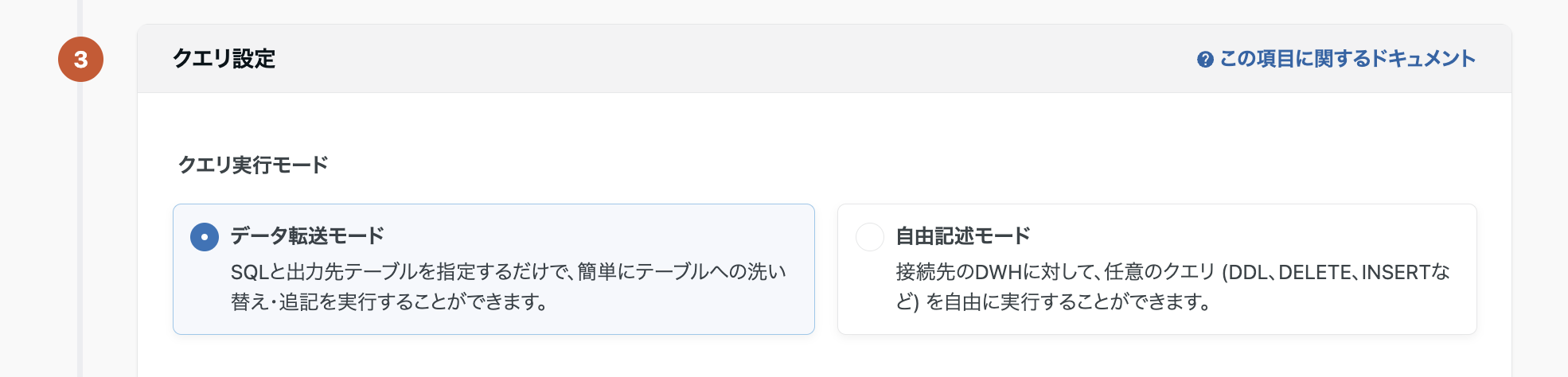 【クエリ実行モード】「データ転送モード」と「自由記述モード」の2つのSQL記述方式を選択することができます。