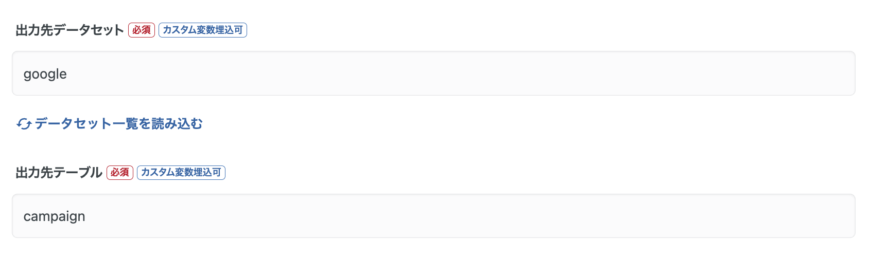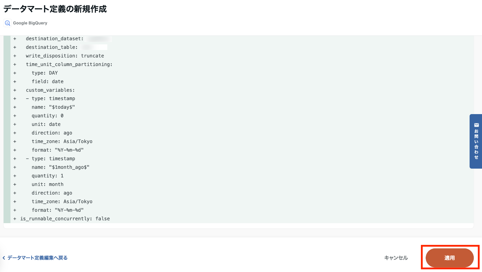データマートの出力先には、加工結果を保存するためのデータセットとテーブル名を指定します。