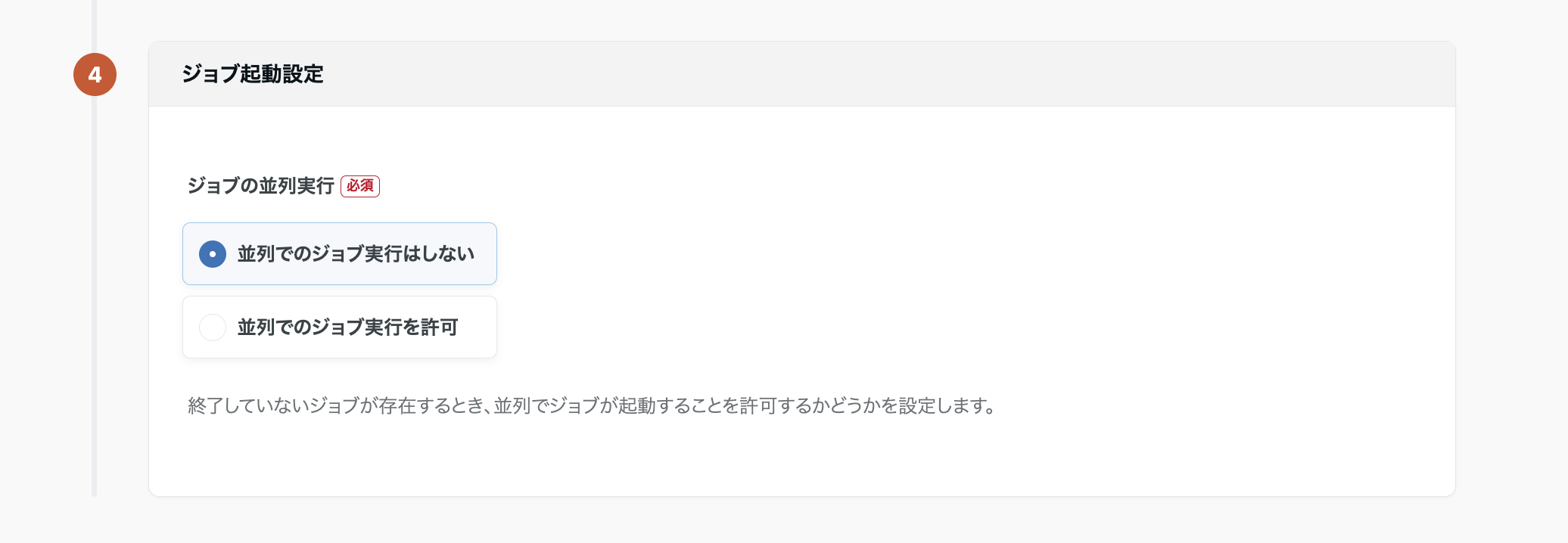 実行時間の短縮が期待できる一方で、ある定義の出力を次の定義が参照するような依存関係がある場合は、「並行でのジョブ実行はしない」を選択しましょう。