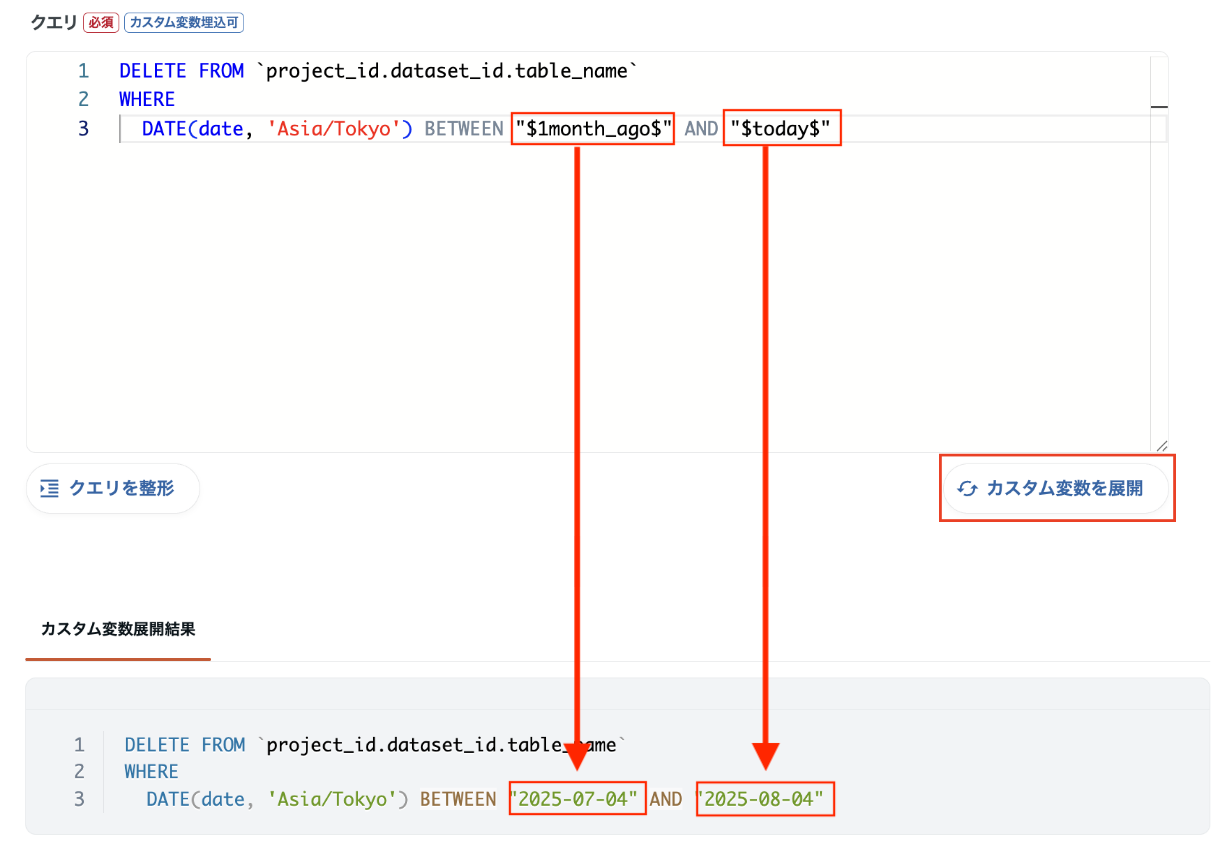 【カスタム変数を展開】TROCCOのデータマート定義で「カスタム変数を展開」すると、SQL内の変数(例:$today$