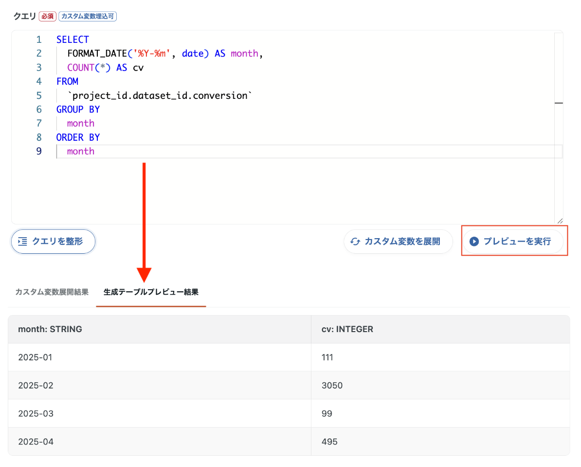 【プレビューを実行】データマート定義のSQLに対して一部データを使ってクエリを実行し、出力されるデータのプレビューを画面上で確認できます。出力先テーブルには書き込まれないため、SQLの文法ミスや参照テーブルの誤りなどを本番実行前に安全にチェックできます。