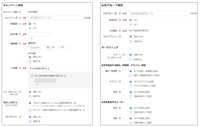 ※友だち追加広告のみ設定できない項目や、設定が固定されてる項目もあるため注意
