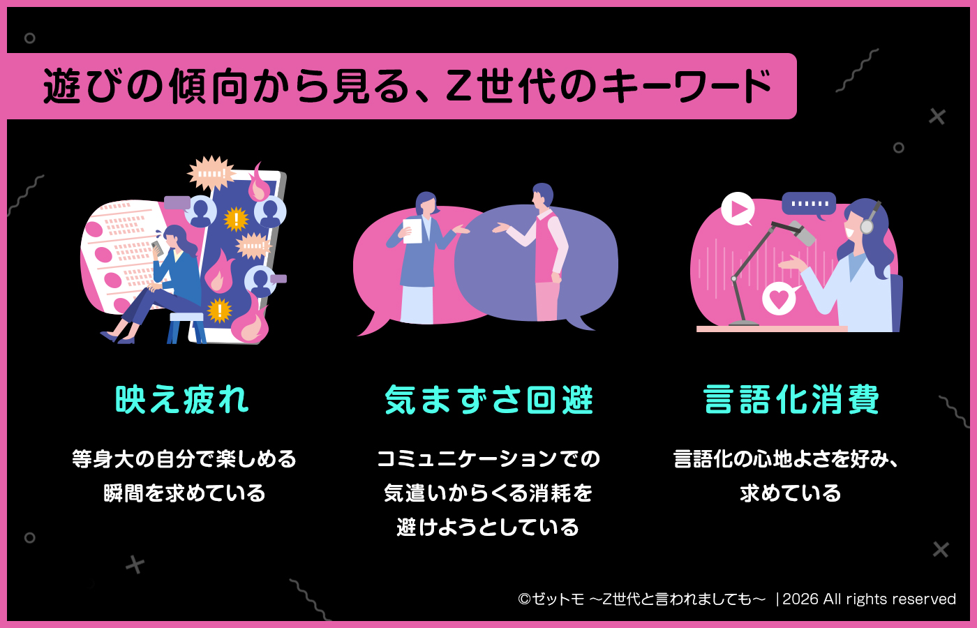 また、遊びを通してZ世代の価値観を覗けた部分があったかと思います。遊びの傾向から見て、Z世代の特徴的なキーワードを3つほど挙げてみました。